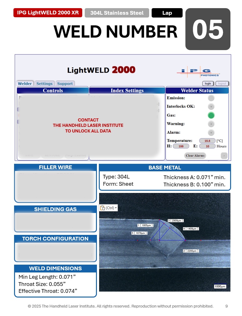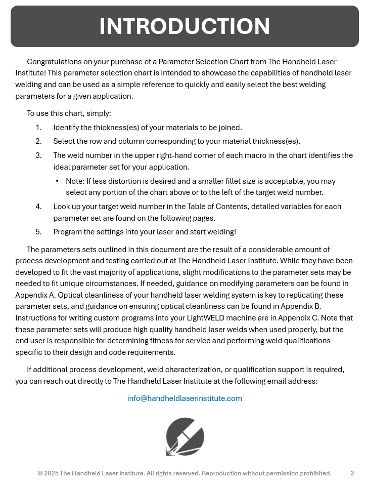 HLI has spent considerable time developing robust parameter sets which are fully viewable to the user and openly tunable with discrete values. This 14-page document includes 7 unique welding procedures in a 5x5 matrix covering lap welds between 5 different thicknesses of 304 stainless steel ranging from 10 to 20 gauge. Also included are appendices covering the customization of these parameter sets, notes on ensuring optical cleanliness for maximum system performance, and instructions on writing your own custom weld programs into your LightWELD machine.