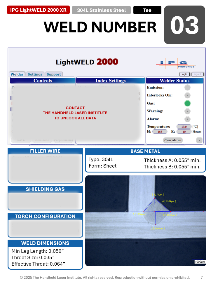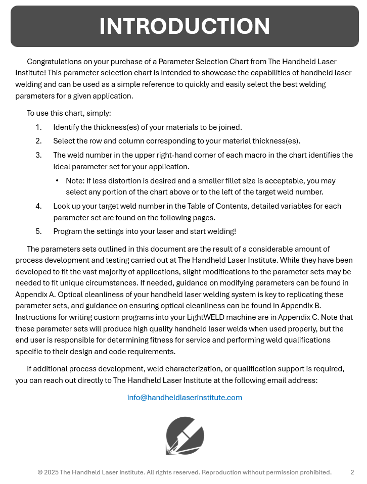 HLI has spent considerable time developing robust parameter sets which are fully viewable to the user and openly tunable with discrete values. This 14-page document includes 7 unique welding procedures in a 5x5 matrix covering tee joints between 5 different thicknesses of 304 stainless steel ranging from 10 to 20 gauge. Also included are appendices covering the customization of these parameter sets, notes on ensuring optical cleanliness for maximum system performance, and instructions on writing your own custom weld programs into your LightWELD machine.